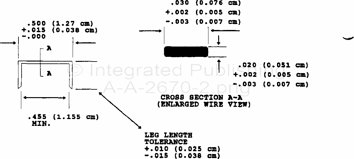 2.1 Type I staples. Type I, medium duty staples shall be in accordance with the dimensions shown in figure 1. The staples shall be preformed to a U-shape, conforming to figure 1. The staples shall be cemented together in strip form, each strip consisting of a minimum of 137 staples and a maximum strip length of 4.48 inches (11.38 cm).